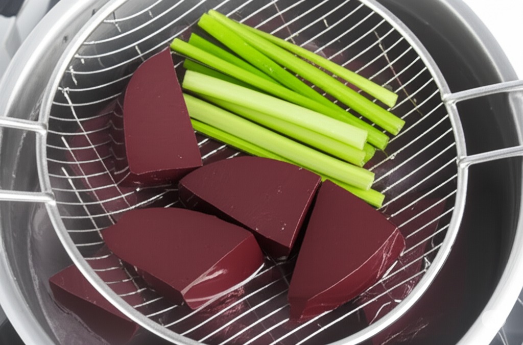 • 30g 鸡血用开水烫制 2 分钟后,冷却备用;