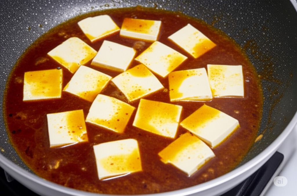 锅中下入 700g 水、麻婆豆腐料 1 袋、4g 老抽,烧开;